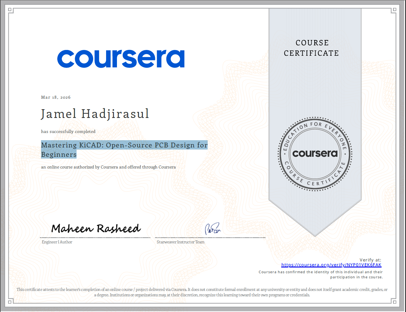 Completed 3-course certification in professional PCB development — covering layout fundamentals, high-speed signal routing, EMI mitigation, Design for Manufacturability, and fabrication file generation using KiCAD.