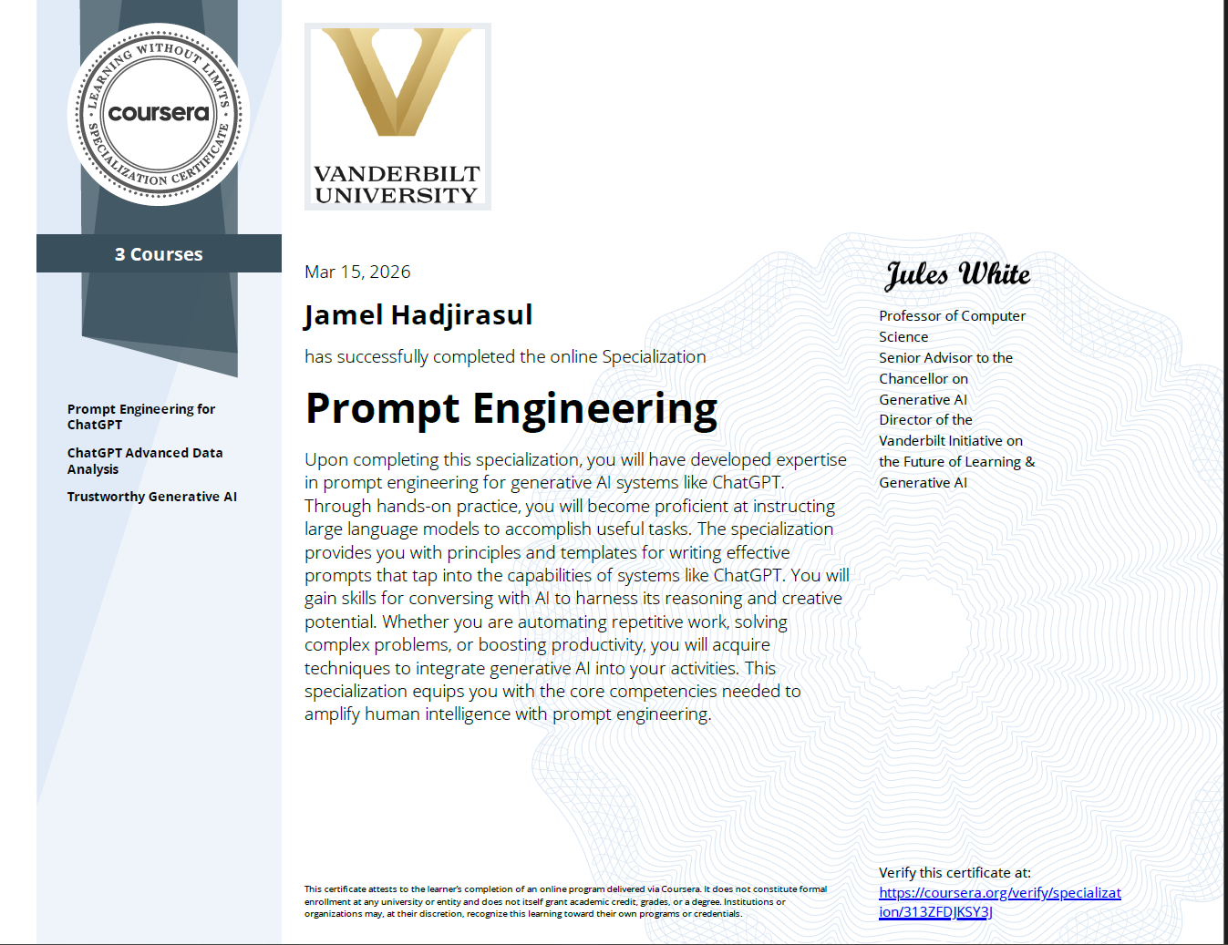 Developed expertise in prompt engineering for generative AI systems. Gained hands-on skills in instructing large language models, automating complex tasks, and integrating AI into real workflows.